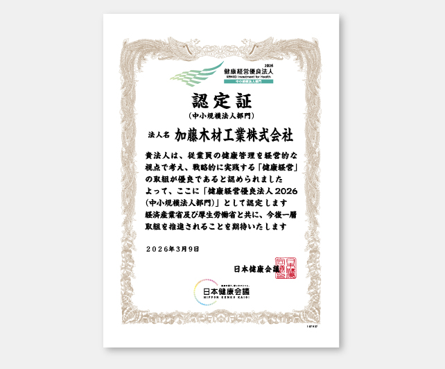 加藤木材工業株式会社は、令和八年3月9日、経済産業省が認定する「健康経営優良法人認定制度」で、「健康経営優良法人2026」中小規模法人部門に7年連続で認定されました。